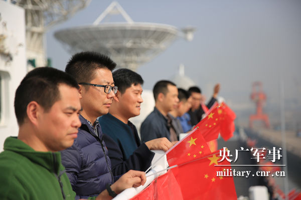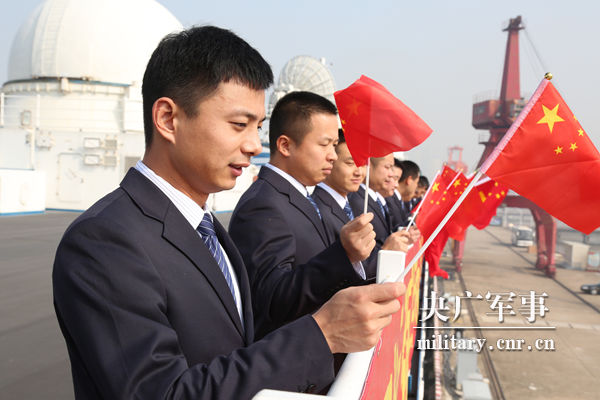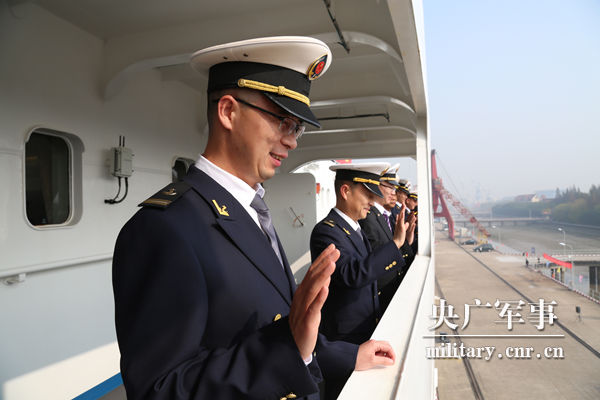 船员们与送行人员挥手告别。王哲 摄