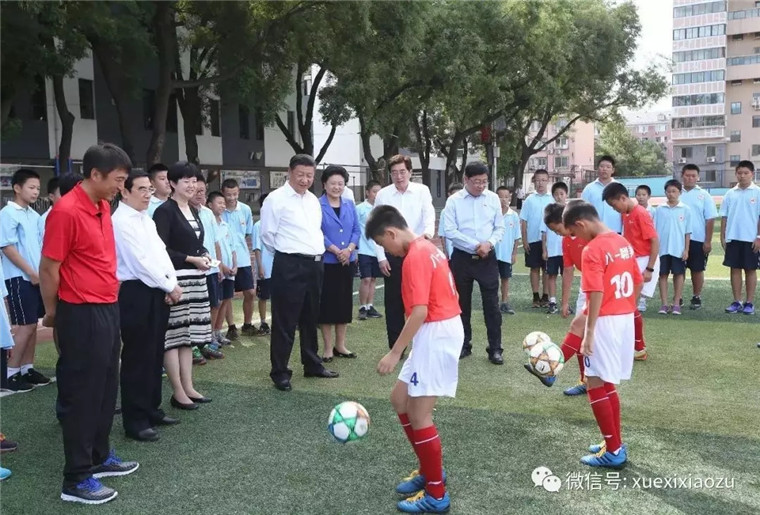 2017年9月9日,北京八一学校操场。小足球队员正训练带球过人,吸引了习近平的目光。“50多年前我就在这个地方踢过球。那时候还是土场子。我们的球队在北京市比赛中拿过冠军,在全国比赛得了第四名。”