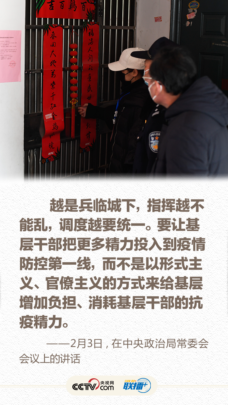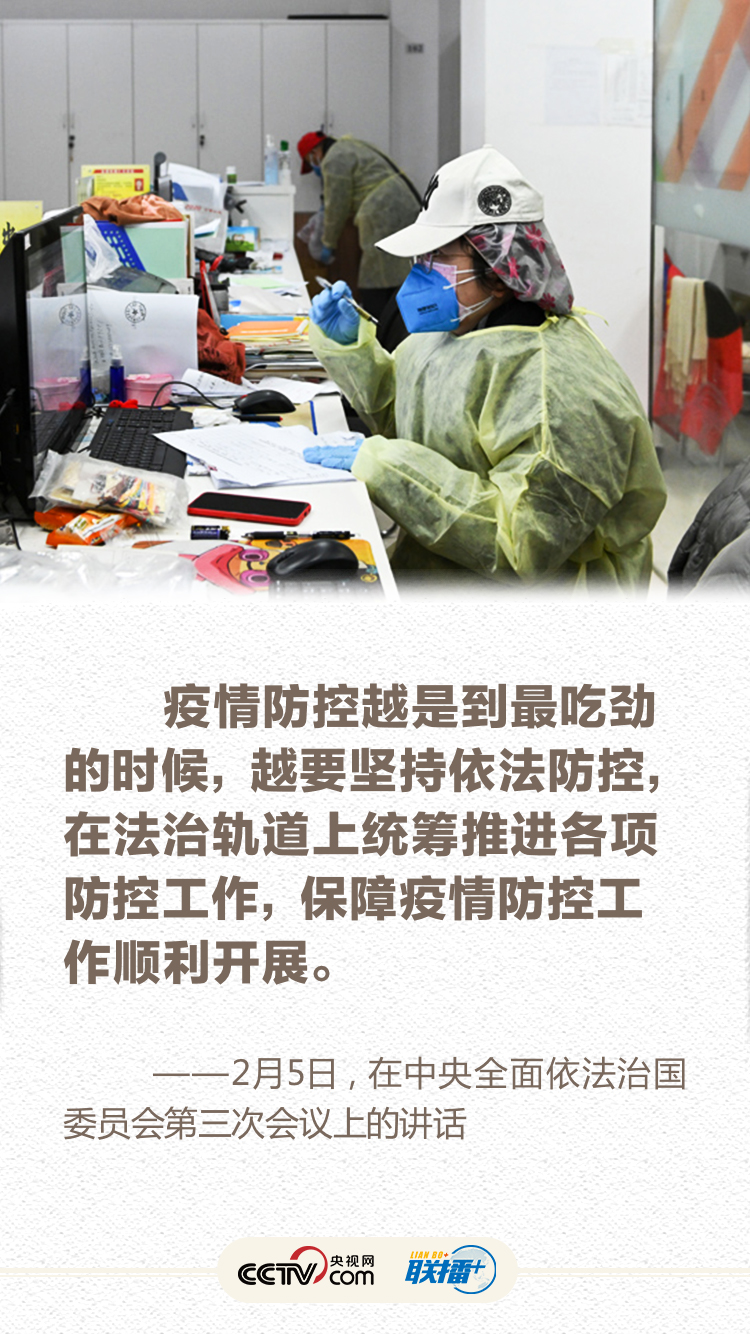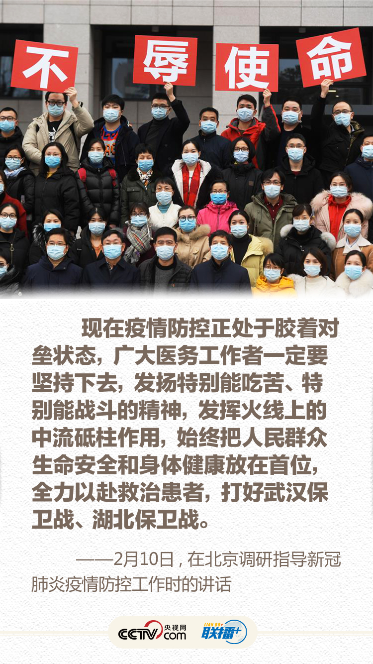 联播+ 1月7日主持召开中央政治局常委会会议,对新冠肺炎疫情防控工作提出要求;1月20日就疫情防控作出重要指示,强调“要把人民群众生命安全和身体健康放在第一位”;1月28日会见世卫组织总干事,指出“疫情是魔鬼,我们不能让魔鬼藏匿”;2月10日在北京调研指导疫情防控工作,要求以更坚定的信心、更顽强的意志、更果断的措施,坚决打赢疫情防控的人民战争、总体战、阻击战……