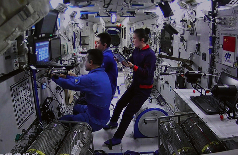 1月8日在北京航天飞行控制中心拍摄的神舟十三号航天员乘组进行手控遥操作天舟二号货运飞船与空间站组合体交会对接试验,航天员通过手控遥操作方式控制货运飞船。新华社记者 郭中正 摄