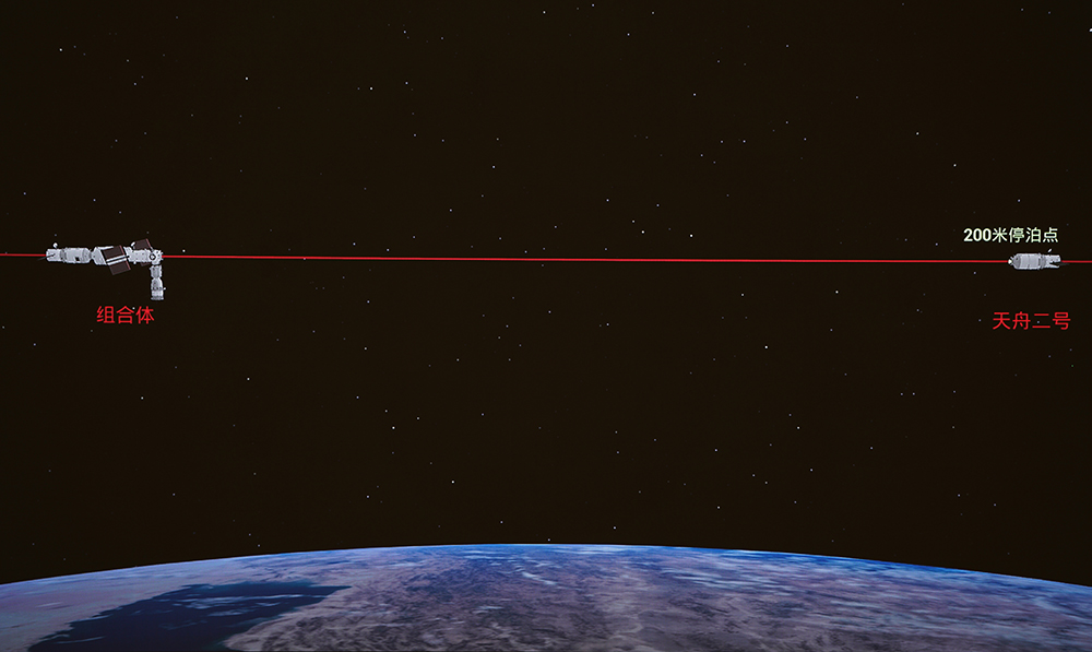 试验开始后,天舟二号货运飞船从核心舱节点舱前向端口分离,航天员通过手控遥操作方式,控制货运飞船撤离至预定停泊点。短暂停泊后,转入平移靠拢段,控制货运飞船与空间站组合体精准完成前向交会对接。