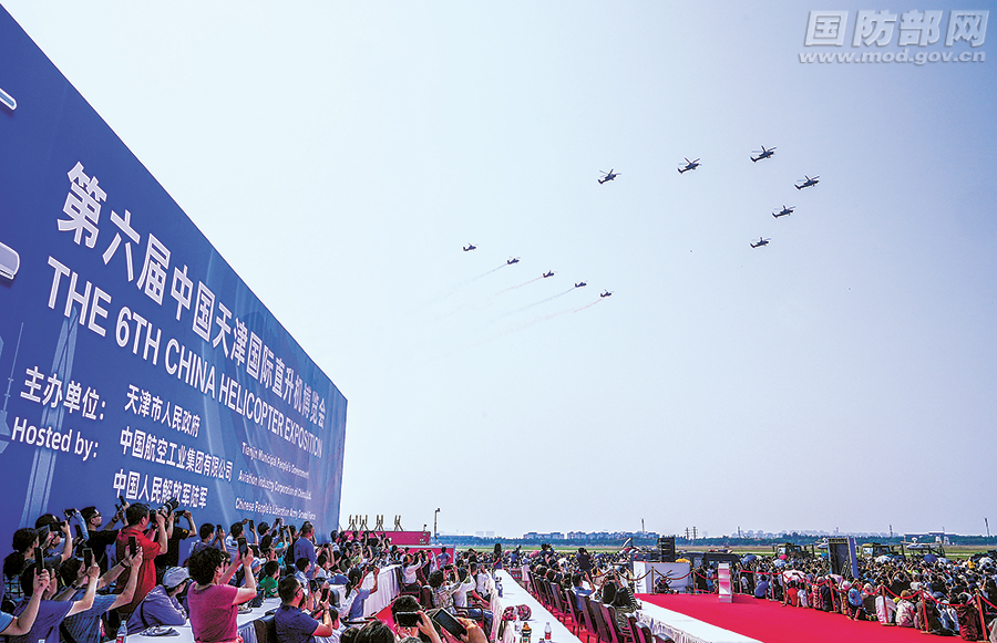 伴着螺旋桨的隆隆轰鸣,陆军“风雷”飞行表演队飞行员驾驶直升机组成“八一”字样,在空中大速度通场,拉开第六届中国天津国际直升机博览会的帷幕。
