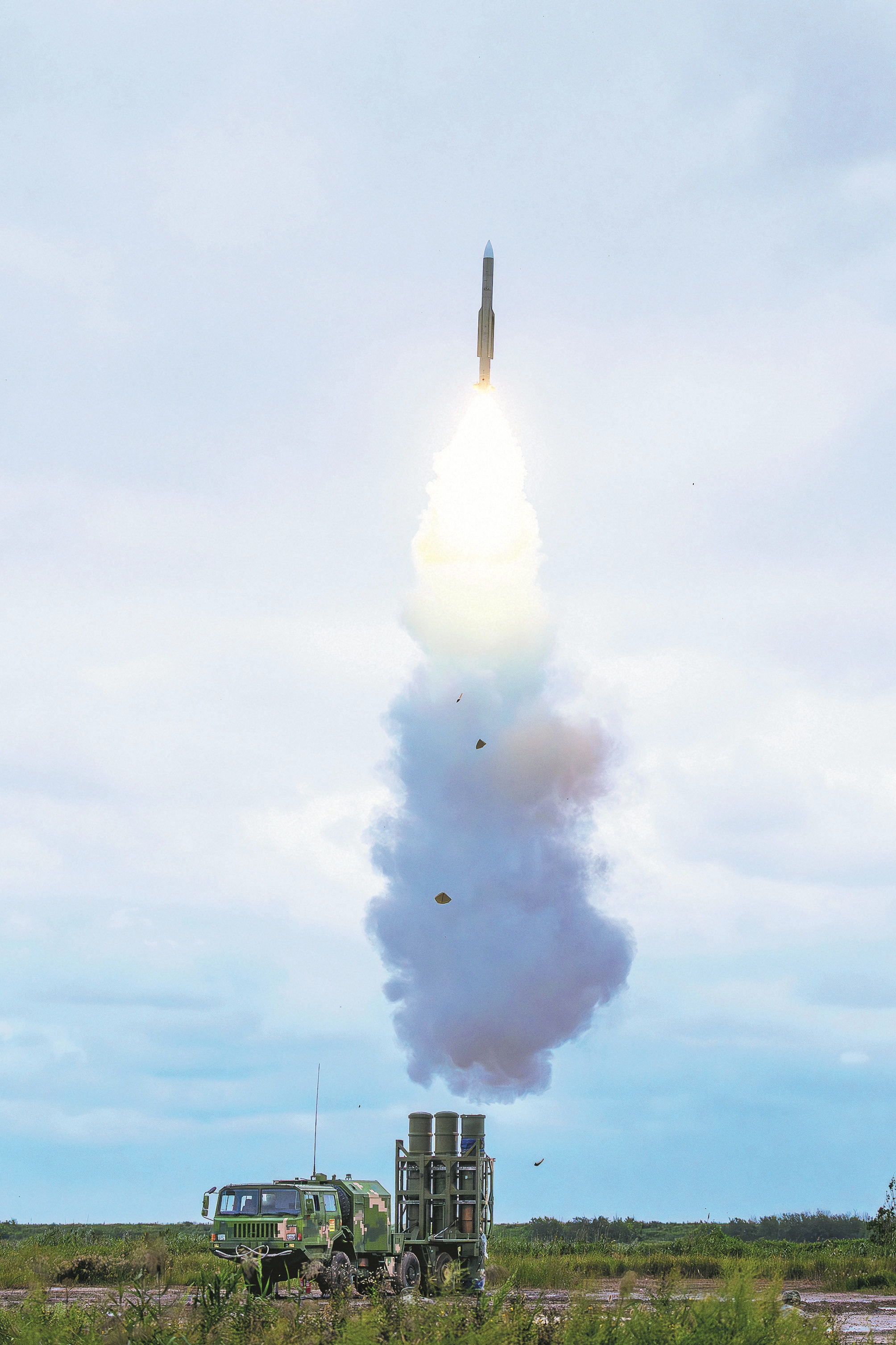 与此同时,部署在阵地前沿的高炮分队严阵以待。“发射!”指挥员话音刚落,一枚枚炮弹破膛而出,在天地间织出一张火力覆盖网,成功摧毁目标。