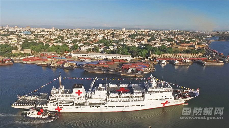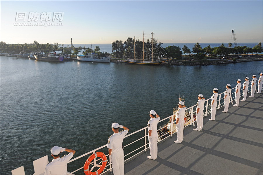 当地时间1日上午7时30分许,和平方舟缓缓驶进圣多明各港。停泊在港内的多海军舰艇悬挂满旗,舰员在甲板分区列队,随着一长声鸣笛,整齐敬礼,表达热烈欢迎。和平方舟悬挂满旗致谢,鸣笛一长声还礼,海军官兵行举手礼致敬。