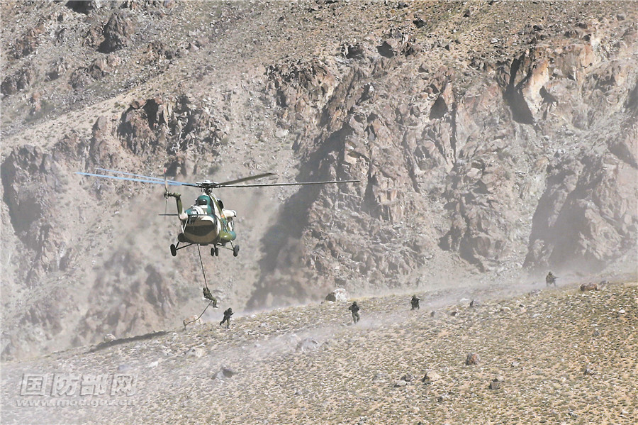 直升机搭载特战队员实施机降。
