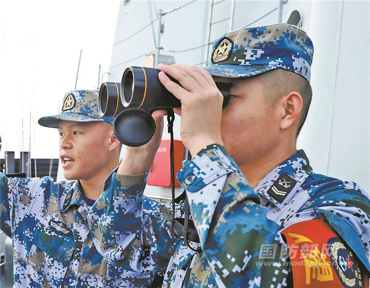 反恐反海盗演练中,瞭望更观察海面情况。