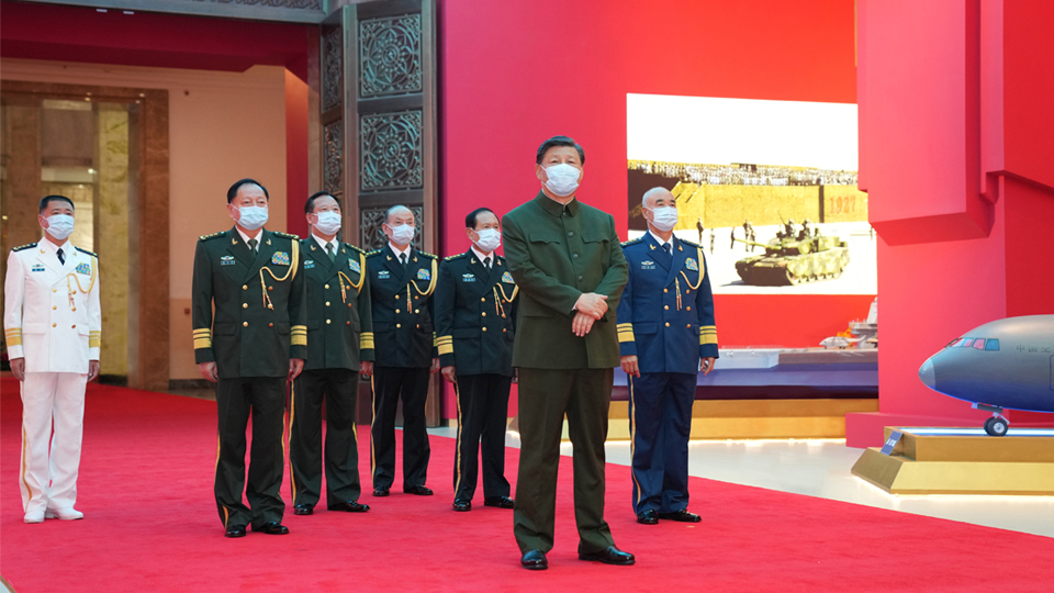 下午4时30分许,习近平来到中国人民革命军事博物馆,步入展厅参观展览。展览聚焦以习近平同志为核心的党中央领导国防和军队建设的伟大实践,安排8个单元展区,设置“党在新时代的强军目标”、“重整行装再出发”、“砺剑铸盾 奔向一流”、“大好河山 寸土不让”、“爱我人民爱我军”、“深情励三军 奋进新征程”等重点展项,通过1400余件文物实物、630余张照片、近百套武器装备模型以及大量图表、视频、艺术作品、互动项目等,生动展示了新时代国防和军队建设的壮阔历程和伟大成就,充分展现了人民军队忠诚维护核心、矢志奋斗强军的昂扬风貌。习近平不时驻足观看,认真听取讲解,询问有关情况。