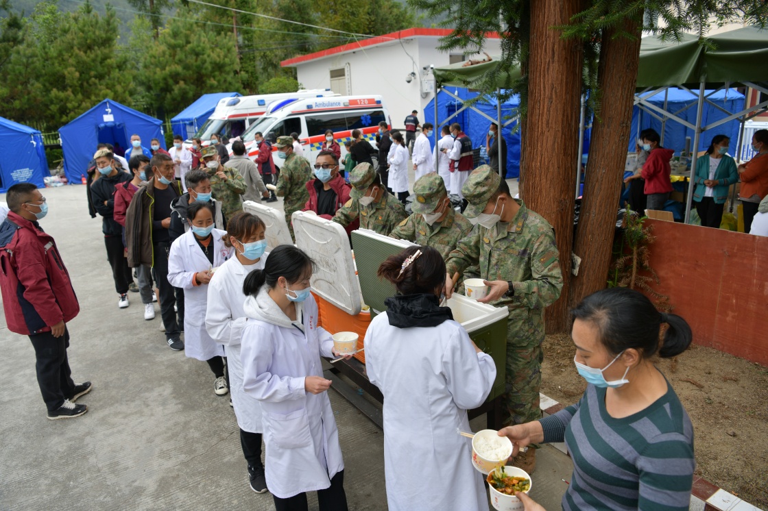 9月6日,西藏军区川藏兵站部某大站救援队抵达泸定县磨西镇,开设临时热食供应站为救援人员和受灾群众提供保障。新华社发(任云 摄)