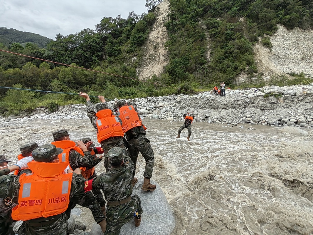 9月6日,武警四川总队甘孜支队救援官兵在泸定县磨西镇通过绳索前往河对岸,救助被困群众。 新华社发(张文轩 摄)