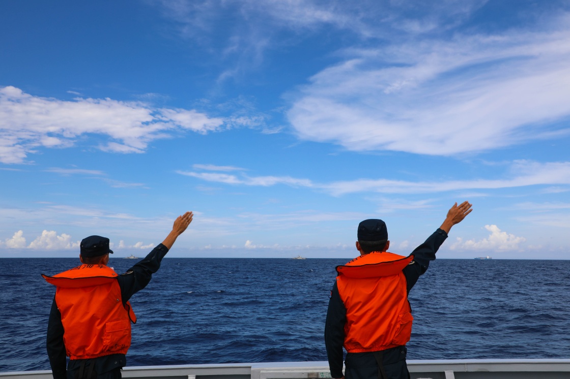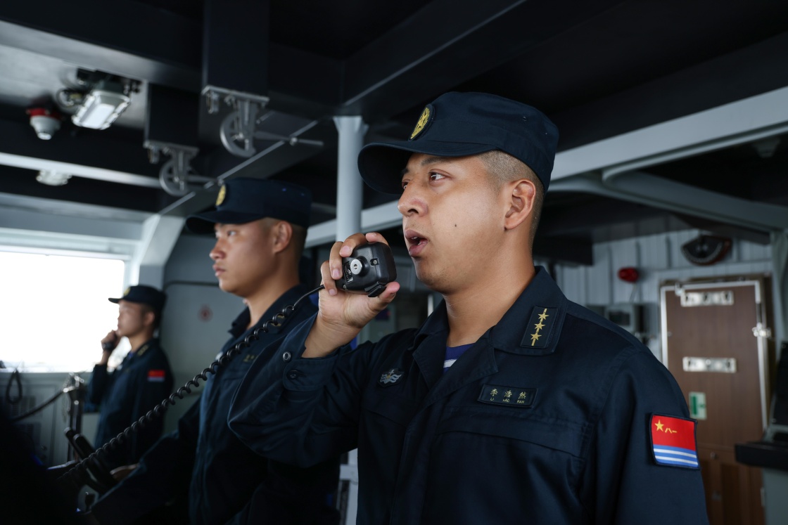 6月26日,在中越第36次北部湾联合巡逻中,中方舰艇官兵下达口令。新华社发(佟佳峻 摄)