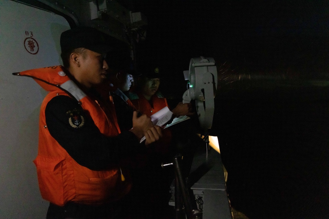 6月26日,在中越第36次北部湾联合巡逻中,中方舰艇官兵发送灯光信号。新华社发(佟佳峻 摄)
