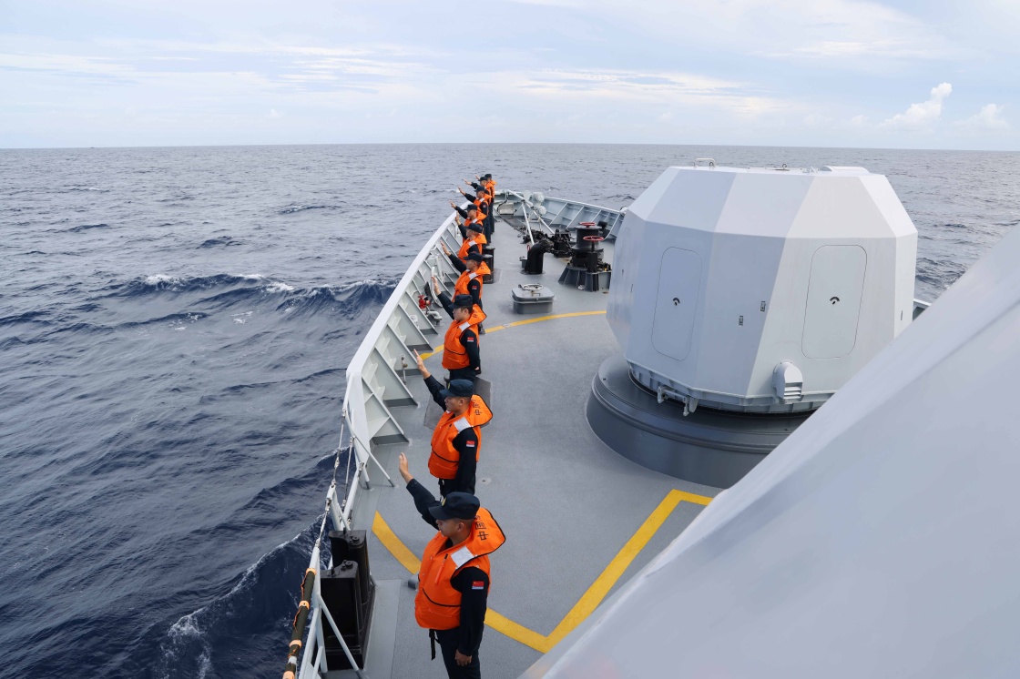 6月27日,中越第36次北部湾联合巡逻结束,中方舰艇官兵向越方舰艇官兵挥手告别。新华社发(周璐瑶 摄)