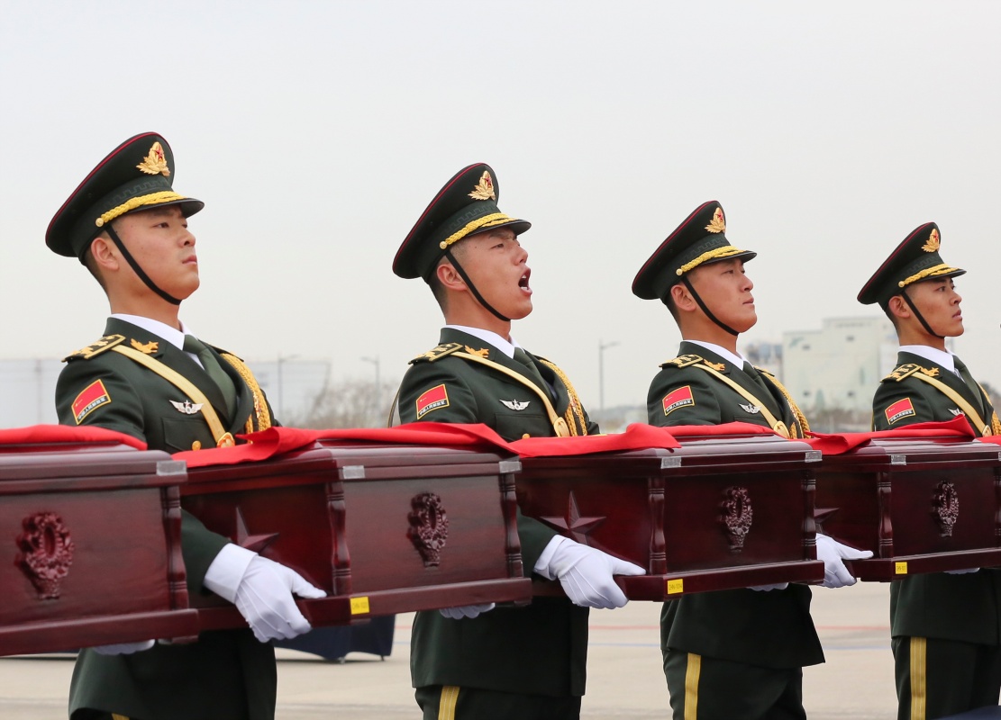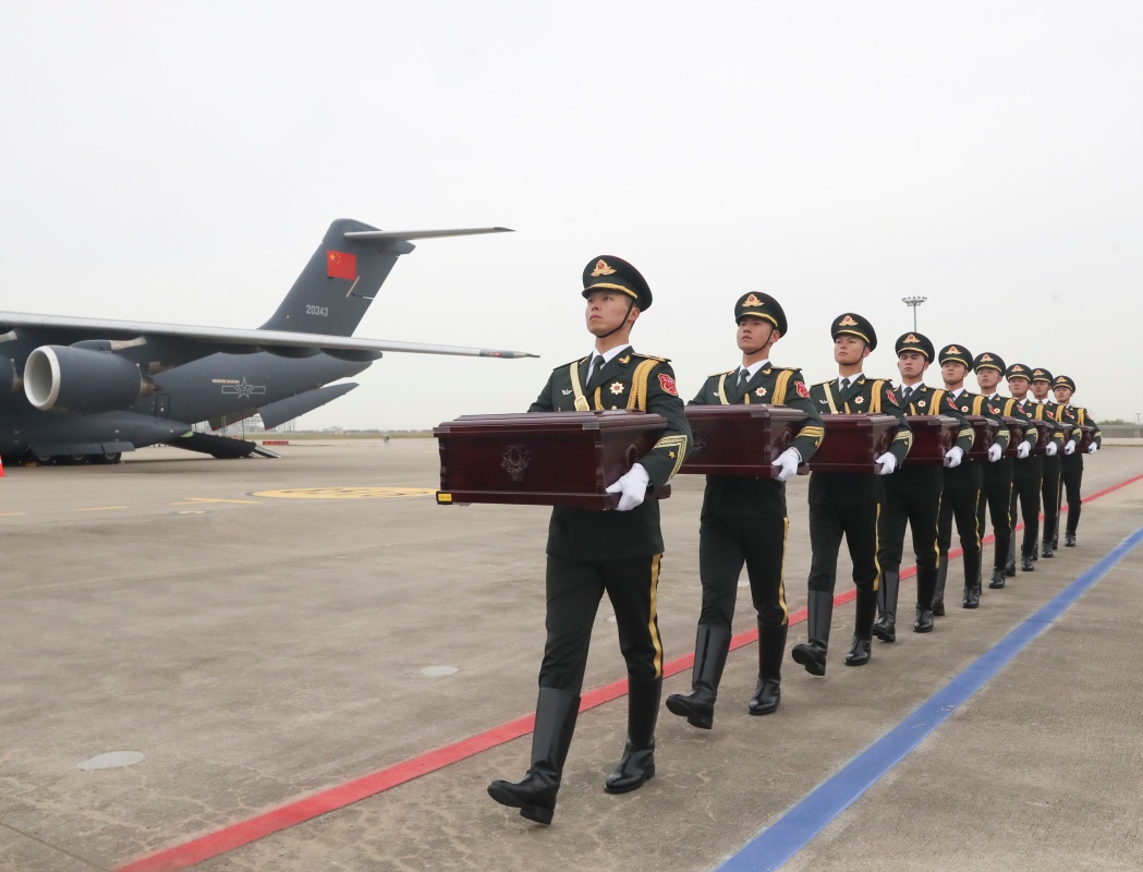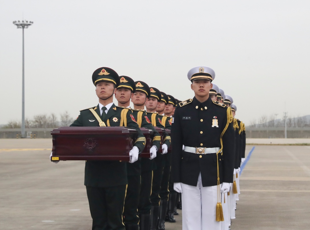 4月22日上午,中韩双方在韩国仁川国际机场共同举行交接仪式,韩方向中方移交第十三批12位在韩中国人民志愿军烈士遗骸及146件遗物。退役军人事务部副部长徐耀率中方交接代表团、韩国国防部次官李斗熙率韩国送还中国军人遗骸代表团出席仪式。中韩双方代表现场签署交接书,中方举行悼念仪式,现场唱响中华人民共和国国歌,中国驻韩国大使戴兵为志愿军烈士棺椁覆盖国旗,中方全体人员向志愿军烈士遗骸行三鞠躬礼,中国人民解放军仪仗司礼大队礼兵持国旗护送烈士棺椁登上解放军空军运-20B运输机,烈士英灵将回到祖国和人民怀抱。