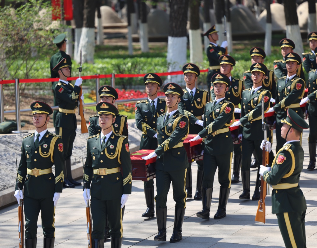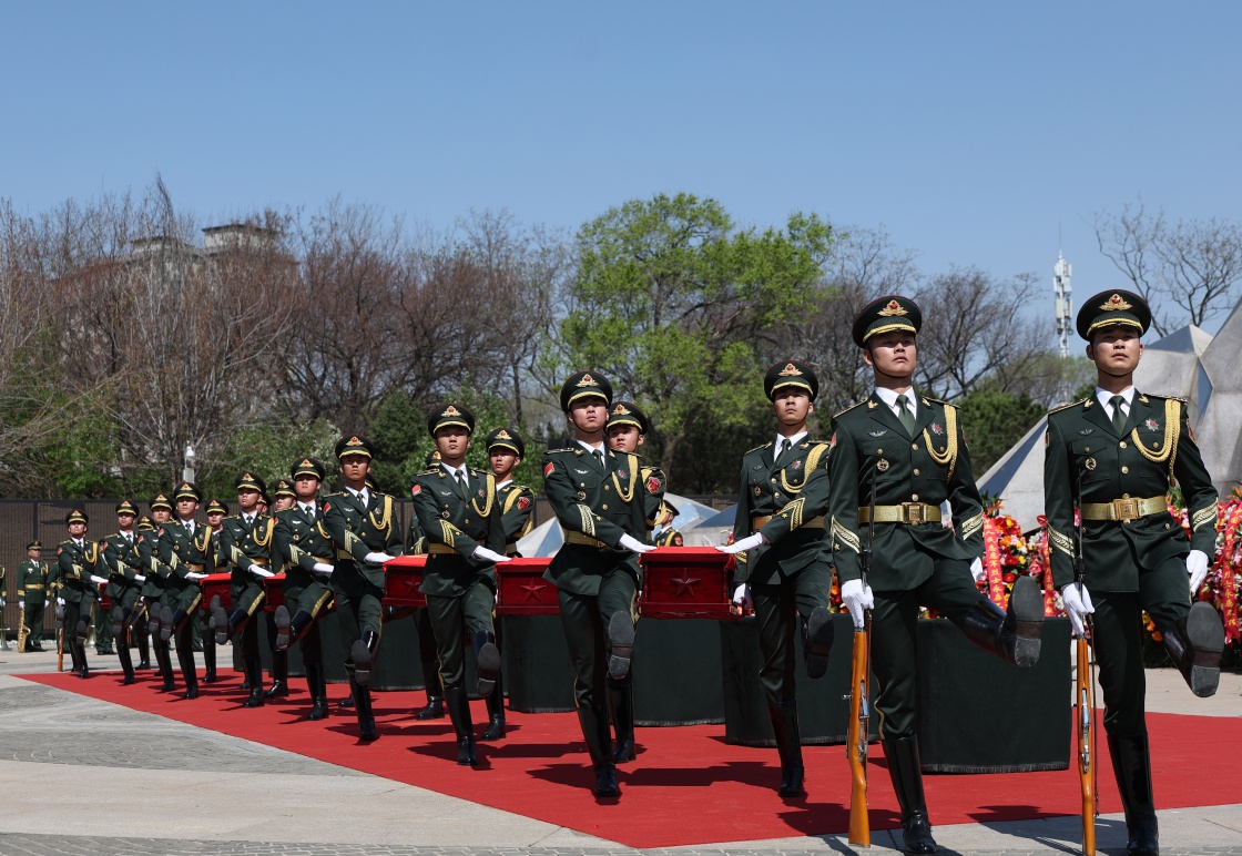 4月23日,礼兵护送志愿军烈士遗骸棺椁就位。新华社记者 韩赫 摄