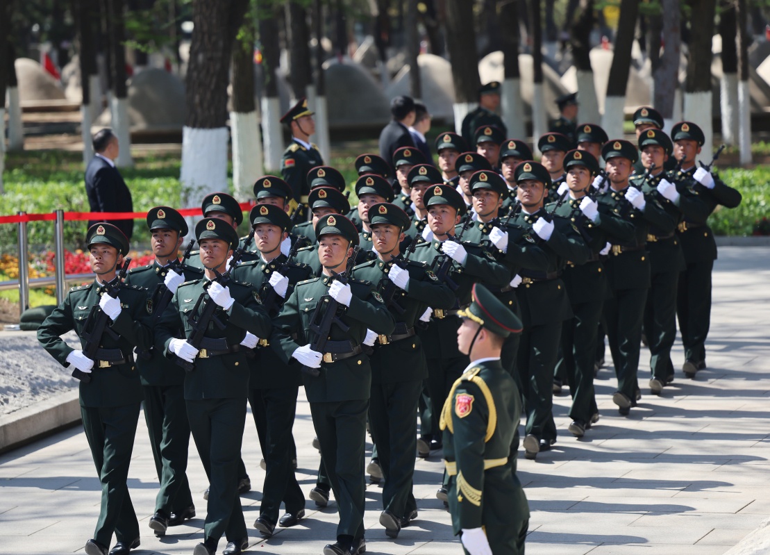 4月23日,在沈阳抗美援朝烈士陵园,礼兵整齐列队。新华社记者 李钢 摄