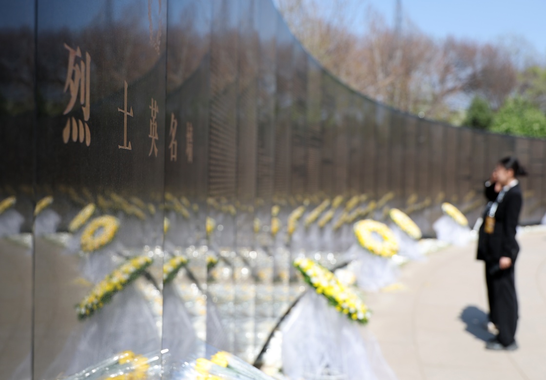 4月23日,在沈阳抗美援朝烈士陵园,人们向烈士敬献鲜花,并瞻仰烈士英名墙。新华社记者 李钢 摄