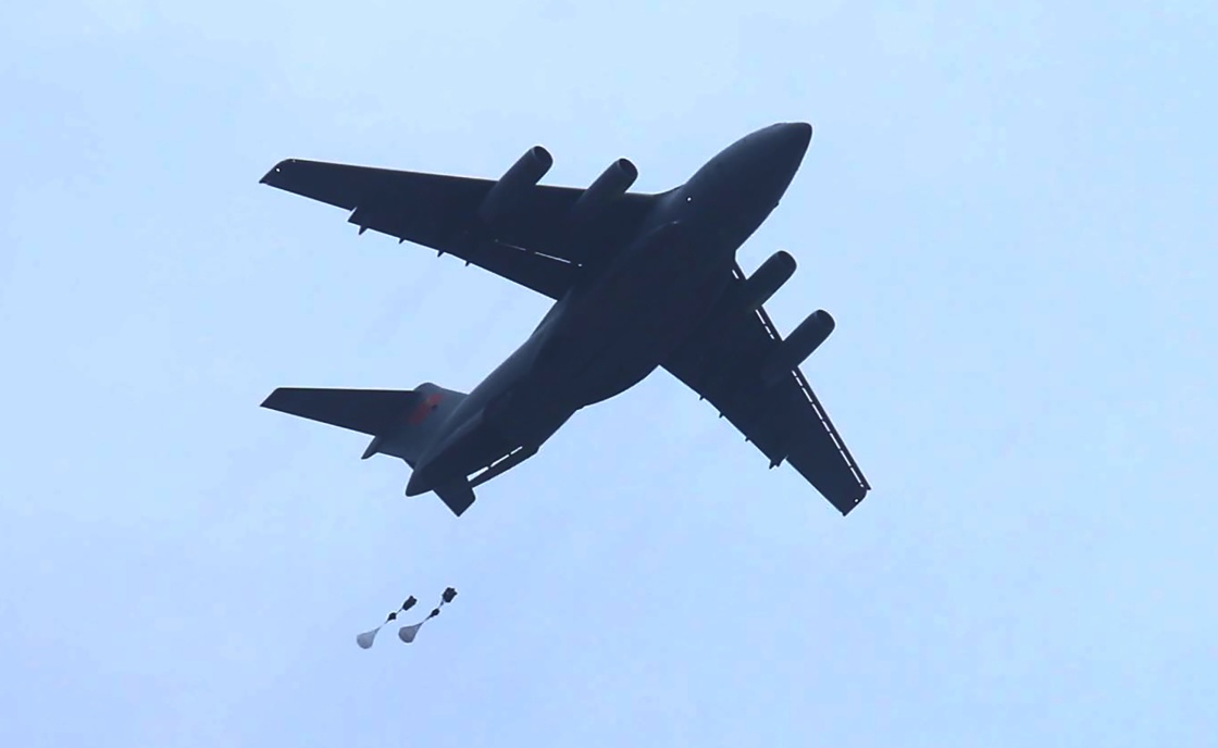 中国空军大型运输机运-20与空降兵部队联合开展空降空投训练(资料照片)。