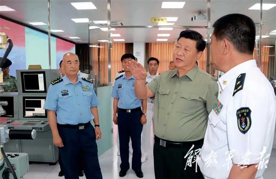 习近平在某潜艇部队综合模拟楼察看部队训练情况,叮嘱有关方面加强训练条件建设,为部队训练提供有力支撑。