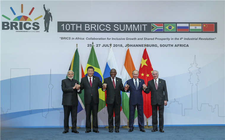 7月26日,金砖国家领导人第十次会晤在南非约翰内斯堡举行。南非总统拉马福萨主持。中国国家主席习近平、巴西总统特梅尔、俄罗斯总统普京、印度总理莫迪出席。这是五国领导人合影。新华社记者 谢环驰 摄