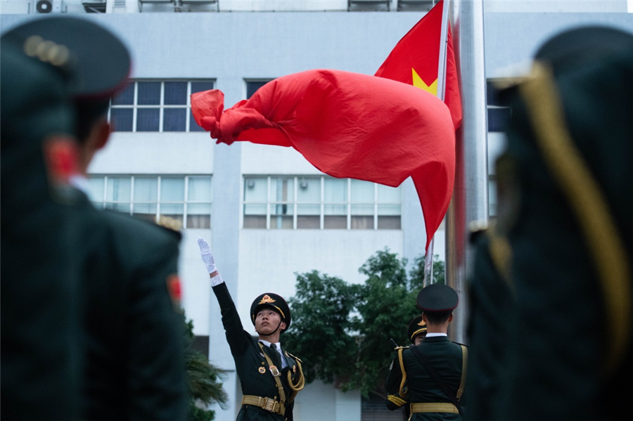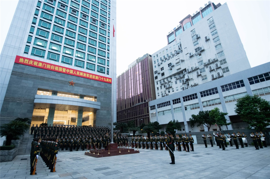 12月20日,中国人民解放军驻澳门部队在澳门新口岸营区举行升国旗仪式,庆祝澳门回归祖国暨中国人民解放军进驻澳门19周年。新华社记者 张金加 摄