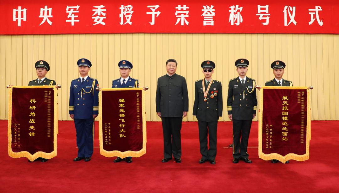 随后,习近平向获得“强军先锋飞行大队”荣誉称号的空军航空兵某旅飞行一大队、获得“航天报国模范地面站”荣誉称号的63798部队地面设备站、获得“科研为战先锋”荣誉称号的63837部队某室,分别颁授奖旗。