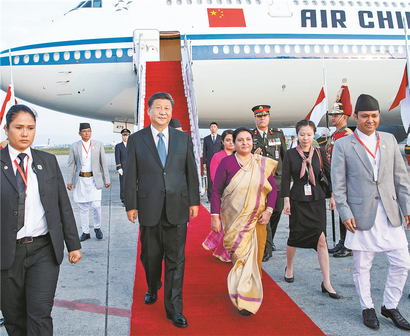 10月12日,国家主席习近平乘专机抵达加德满都,开始对尼泊尔进行国事访问。习近平步出舱门,尼泊尔总统班达里偕女儿乌莎在舷梯旁热情迎接。新华社记者李涛摄