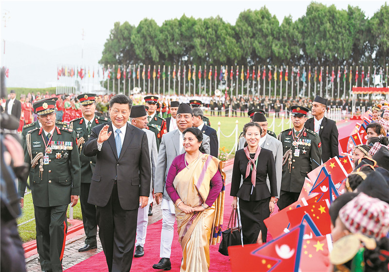 10月12日,国家主席习近平乘专机抵达加德满都,开始对尼泊尔进行国事访问。尼泊尔总统班达里在机场为习近平举行具有浓郁尼泊尔民族特色的欢迎仪式。新华社记者高洁摄