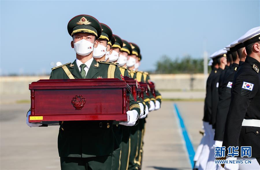 9月27日,在韩国仁川国际机场,韩方(右)向中方礼兵移交中国人民志愿军烈士遗骸。 中韩双方27日在韩国仁川国际机场举行第七批在韩中国人民志愿军烈士遗骸交接仪式。 新华社记者 王婧嫱 摄