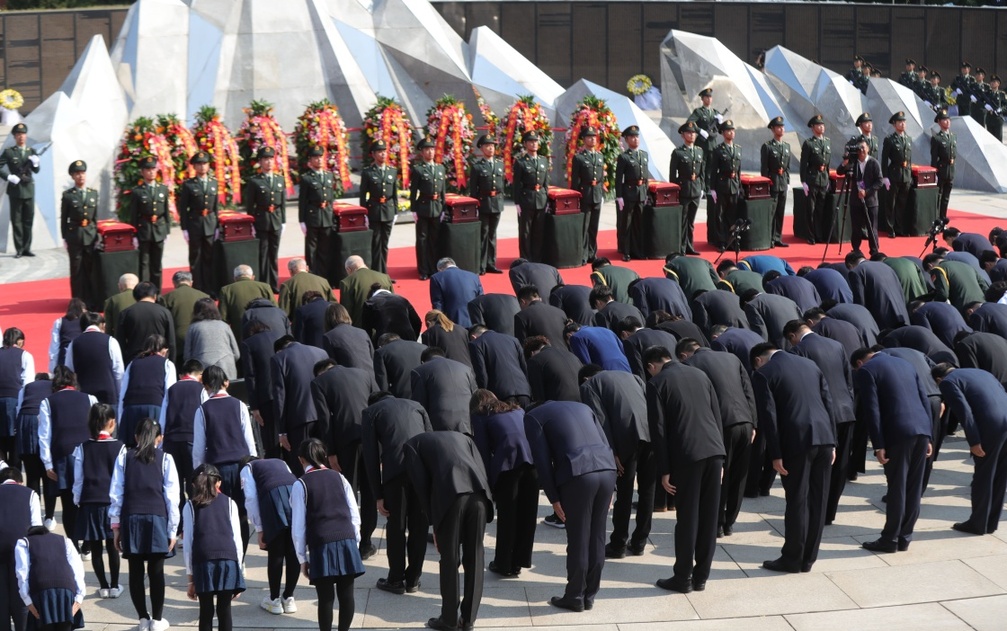 9月28日,人们向志愿军烈士遗骸鞠躬。新华社记者 杨青 摄