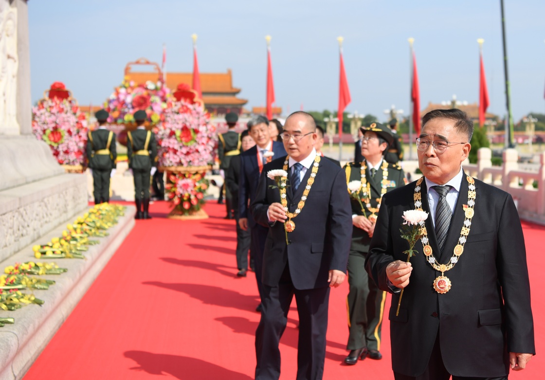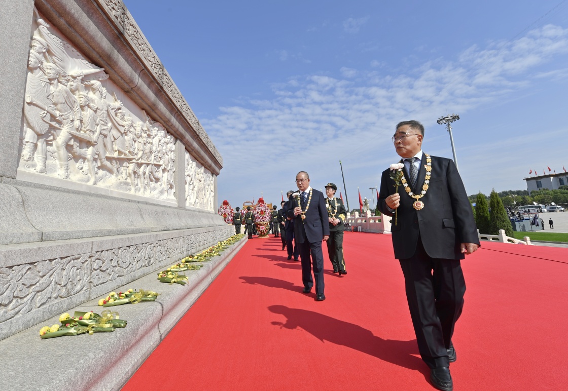 9月30日,烈士纪念日向人民英雄敬献花篮仪式在北京天安门广场隆重举行。这是张伯礼(右一)、张定宇(右三)和陈薇(右二)向人民英雄敬献鲜花。新华社记者 申宏 摄