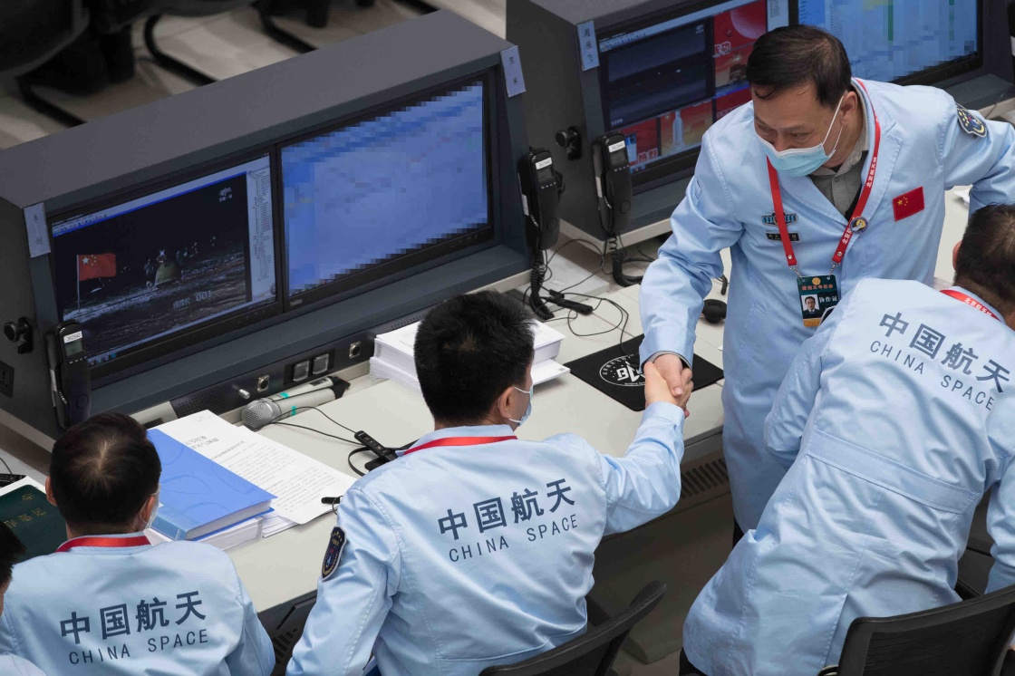 12月17日,在北京航天飞行控制中心,工作人员握手庆祝。新华社记者 金立旺 摄
