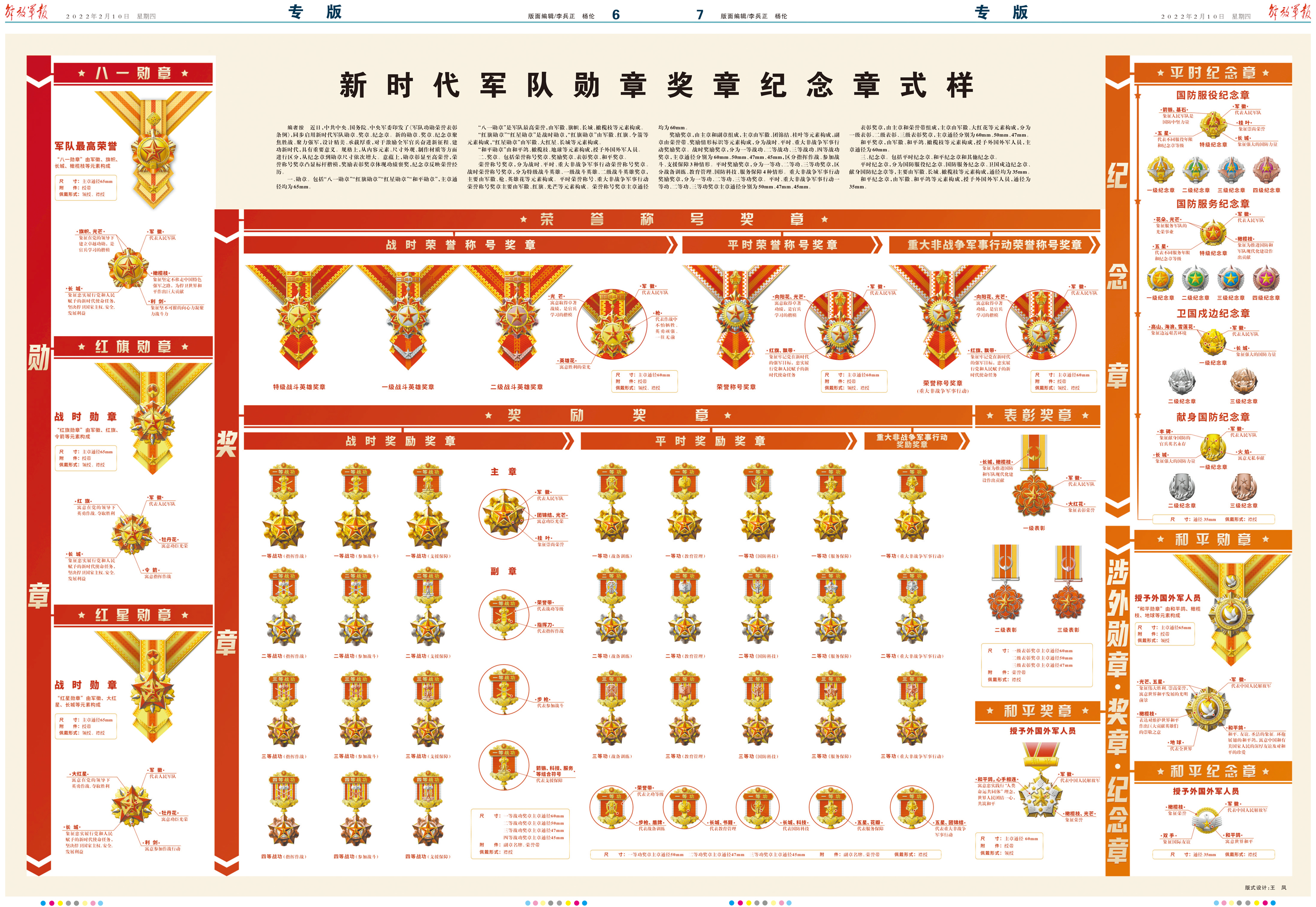 近日,中共中央、国务院、中央军委印发了《军队功勋荣誉表彰条例》,同步启用新时代军队勋章、奖章、纪念章。新的勋章、奖章、纪念章聚焦胜战、聚力强军,设计精美、承载厚重,对于激励全军官兵奋进新征程、建功新时代,具有重要意义。规格上,从内容元素、尺寸外观、制作材质等方面进行区分,从纪念章到勋章尺寸依次增大。意蕴上,勋章彰显至高荣誉,荣誉称号奖章凸显标杆楷模,奖励表彰奖章体现功绩褒奖,纪念章反映荣誉经历。