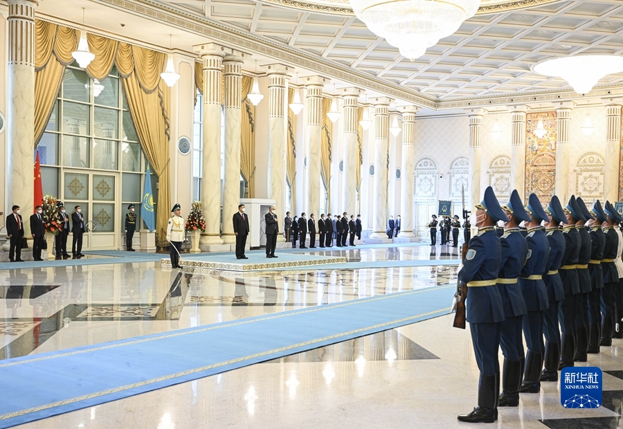 当地时间9月14日,国家主席习近平出席哈萨克斯坦总统托卡耶夫在总统府举行的隆重欢迎仪式。新华社记者 岳月伟 摄