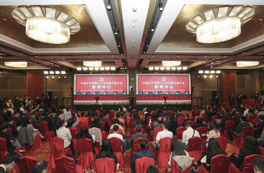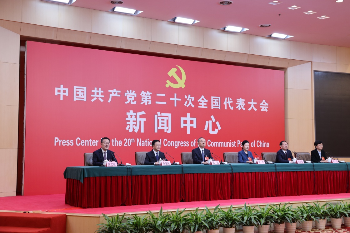 10月19日,中国共产党第二十次全国代表大会新闻中心举行记者招待会。中央政法委副秘书长訚柏,最高人民法院党组副书记、分管日常工作的副院长、一级大法官贺荣,最高人民检察院党组副书记、分管日常工作的副检察长、一级大检察官童建明,公安部党委委员、副部长、国家移民管理局党组书记、局长许甘露,司法部党组成员、副部长左力围绕“坚持以习近平法治思想为指引 努力建设更高水平的法治中国”主题与记者交流。
