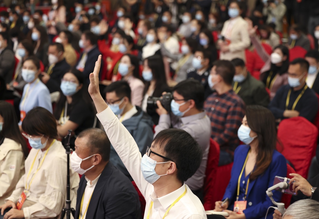 这是记者在分会场举手提问。新华社记者 李明 摄