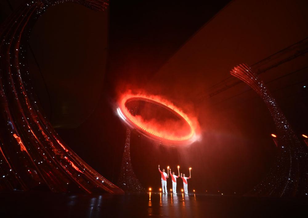 2025年11月9日,第十五届全国运动会开幕式在广东奥林匹克体育中心举行。这是火炬手苏炳添(中)、张家朗(左)、李祎点燃主火炬后向观众致意。新华社记者 肖艺九 摄