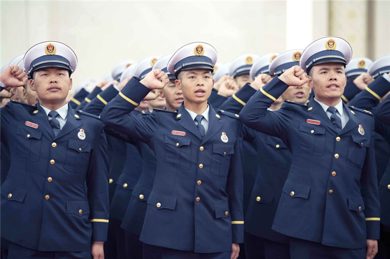 11月9日,国家综合性消防救援队伍授旗仪式在北京人民大会堂举行。这是参加授旗仪式的消防救援人员进行集体宣誓。新华社记者 李涛 摄