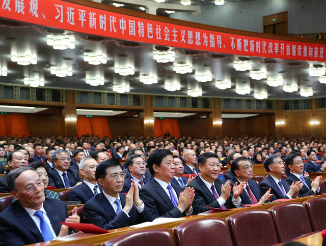 12月14日,庆祝改革开放40周年文艺晚会《我们的四十年》在北京人民大会堂举行。习近平、李克强、栗战书、汪洋、王沪宁、韩正、王岐山等党和国家领导人,与3000多名观众一起观看演出。新华社记者 谢环驰 摄