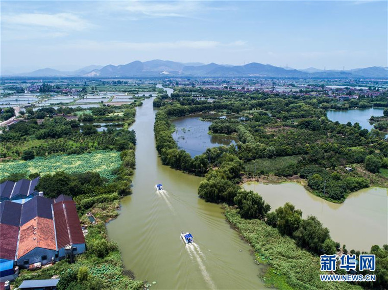 在浙江省湖州市东林镇保健村的河道上,河长及工作人员乘船巡河(2018年7月10日无人机拍摄)。截至2018年6月底,全国31个省份全面建立河长制。新华社记者 徐昱 摄