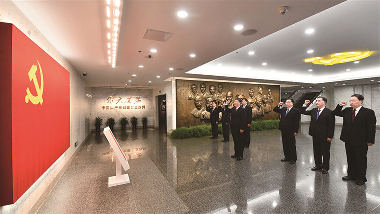 2017年10月31日,中共中央总书记、国家主席、中央军委主席习近平带领中共中央政治局常委李克强、栗战书、汪洋、王沪宁、赵乐际、韩正,瞻仰上海中共一大会址和浙江嘉兴南湖红船。这是31日上午,在上海中共一大会址纪念馆,习近平带领其他中共中央政治局常委同志一起重温入党誓词。 新华社记者 李涛/摄