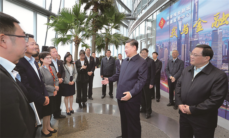 2018年11月6日至7日,中共中央总书记、国家主席、中央军委主席习近平在上海考察。这是6日上午,习近平在上海中心大厦22层的陆家嘴金融城党建服务中心,同正在联合开展主题党日活动的企业党员亲切交谈。 新华社记者 谢环驰/摄