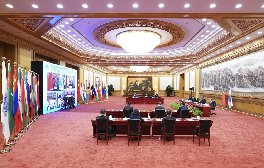 9月17日,国家主席习近平在北京以视频方式出席上海合作组织成员国元首理事会第二十一次会议并发表重要讲话。新华社记者 黄敬文摄