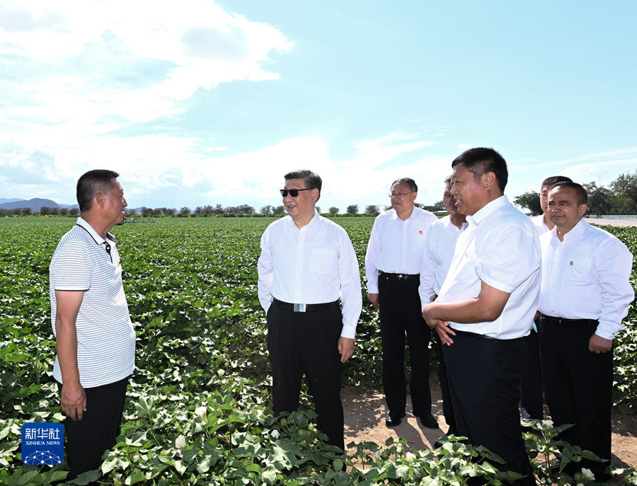 7月12日至15日,中共中央总书记、国家主席、中央军委主席习近平在新疆考察。这是13日下午,习近平在新疆生产建设兵团八师一四三团农一连棉花种植基地考察。新华社记者 谢环驰 摄
