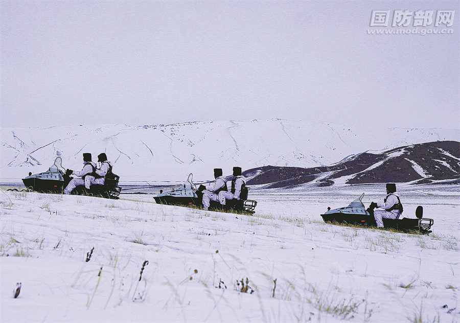 官兵骑乘摩托雪橇前往巡逻地域。