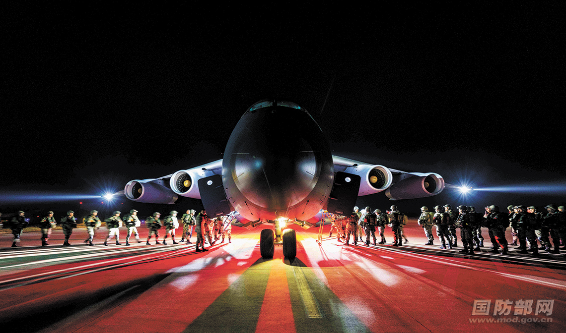 3月底,空降兵某旅组织夜间跳伞训练。图为官兵快速登机。朱海涛摄