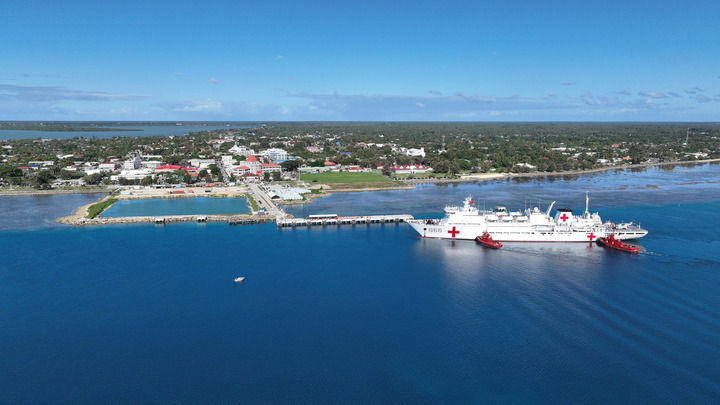 2023年7月28日,执行“和谐使命-2023”任务的中国海军“和平方舟”号医院船抵达汤加王国努库阿洛法港(无人机照片)。新华社发(桂江波 摄)
