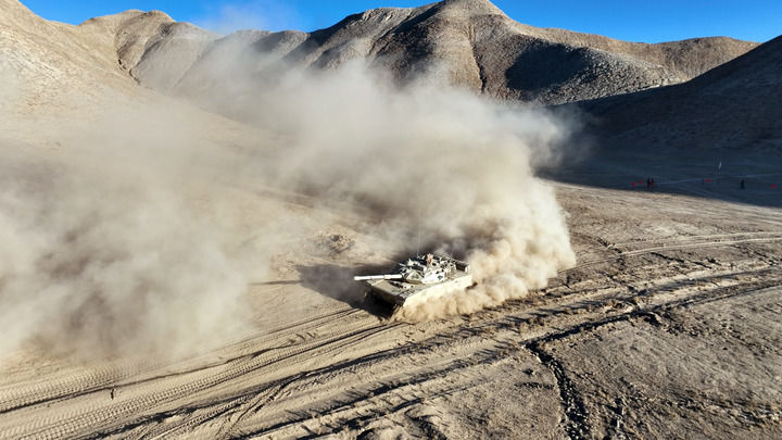 在海拔4000米的野外训练场,西藏军区某旅坦克分队展开复杂山地路段驾驶机动考核(2023年1月3日摄)。新华社发(曹智 摄)