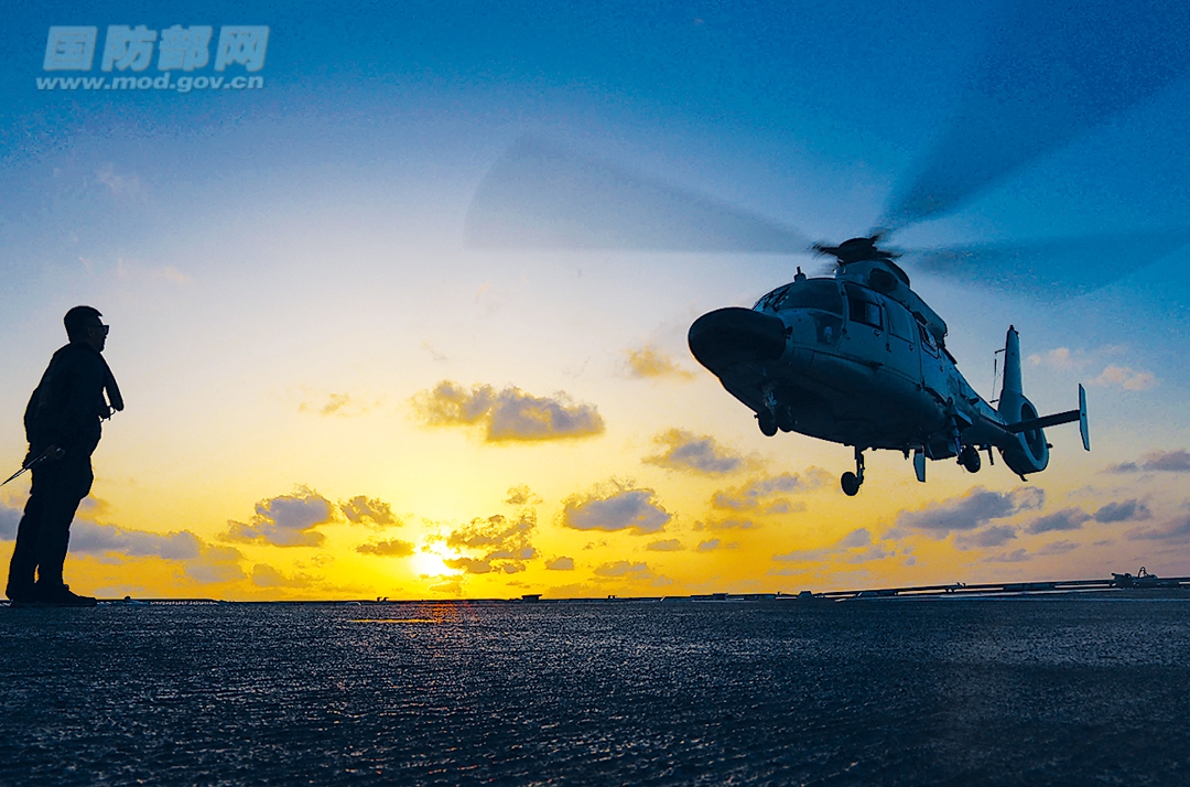 “建立着舰航线,调整姿态!”收到坐标信息,战机迅速锁定目标舰船。甲板上,保障人员早已就位。在信号员引导下,战机建立下滑线,缓慢降低高度,减速飞行,找准时机果断下降,稳稳降落在甲板上。短暂停留后,战机再次升空,飞赴其他空域开展协同反潜、搜救等训练。