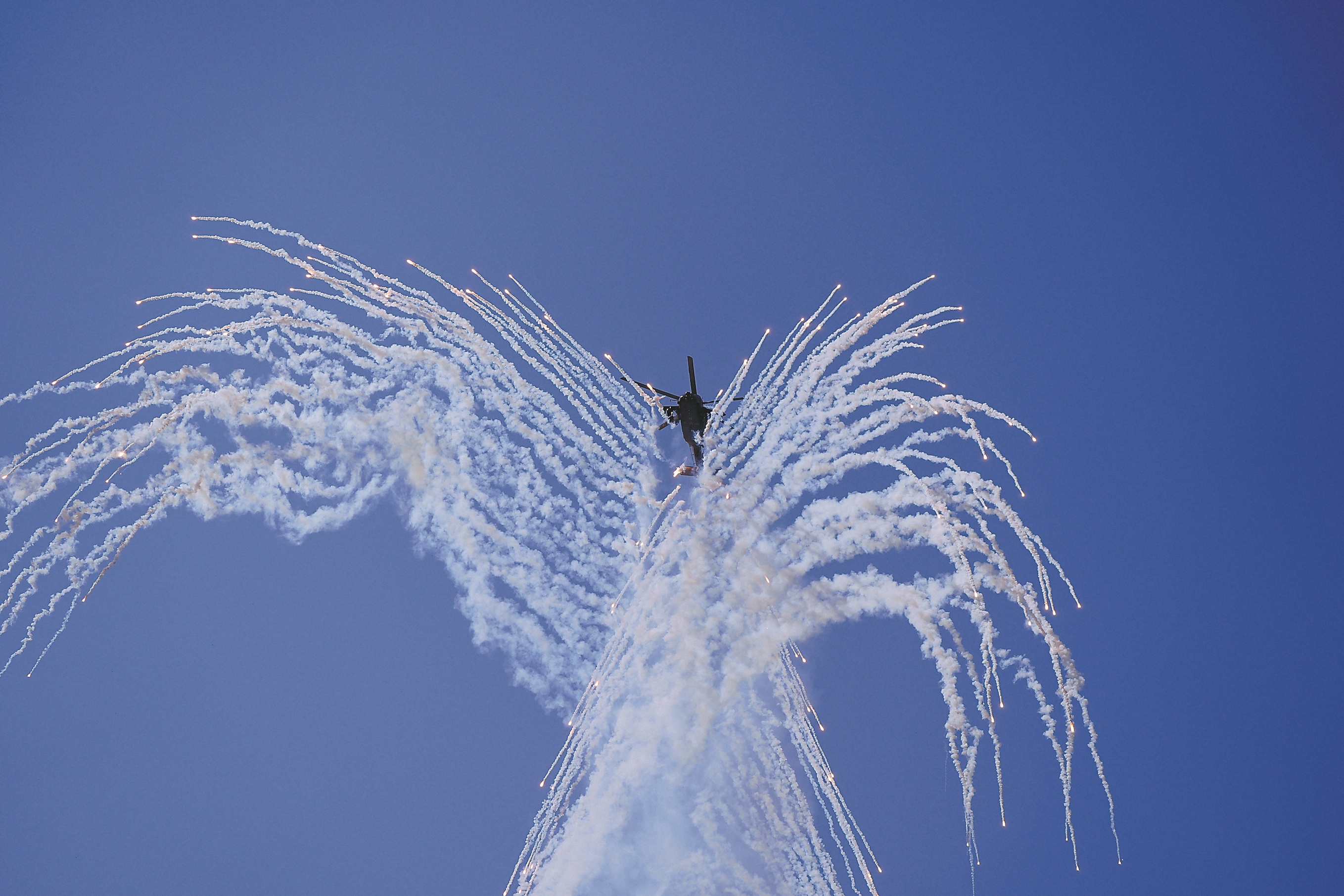 在飞行观摩区人们的欢呼声中,展示垂直爬升动作的直-20T快速上升,稳健灵动。突然,直-20T释放出一排排干扰弹,弹焰和弹迹瞬时在蓝天上绘出醒目的弧线。这是直-20T首次亮相中国天津国际直升机博览会(以下简称“天津直博会”),一系列特技飞行动作,充分展示出它的飞行稳定性与机动能力。