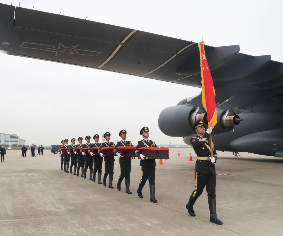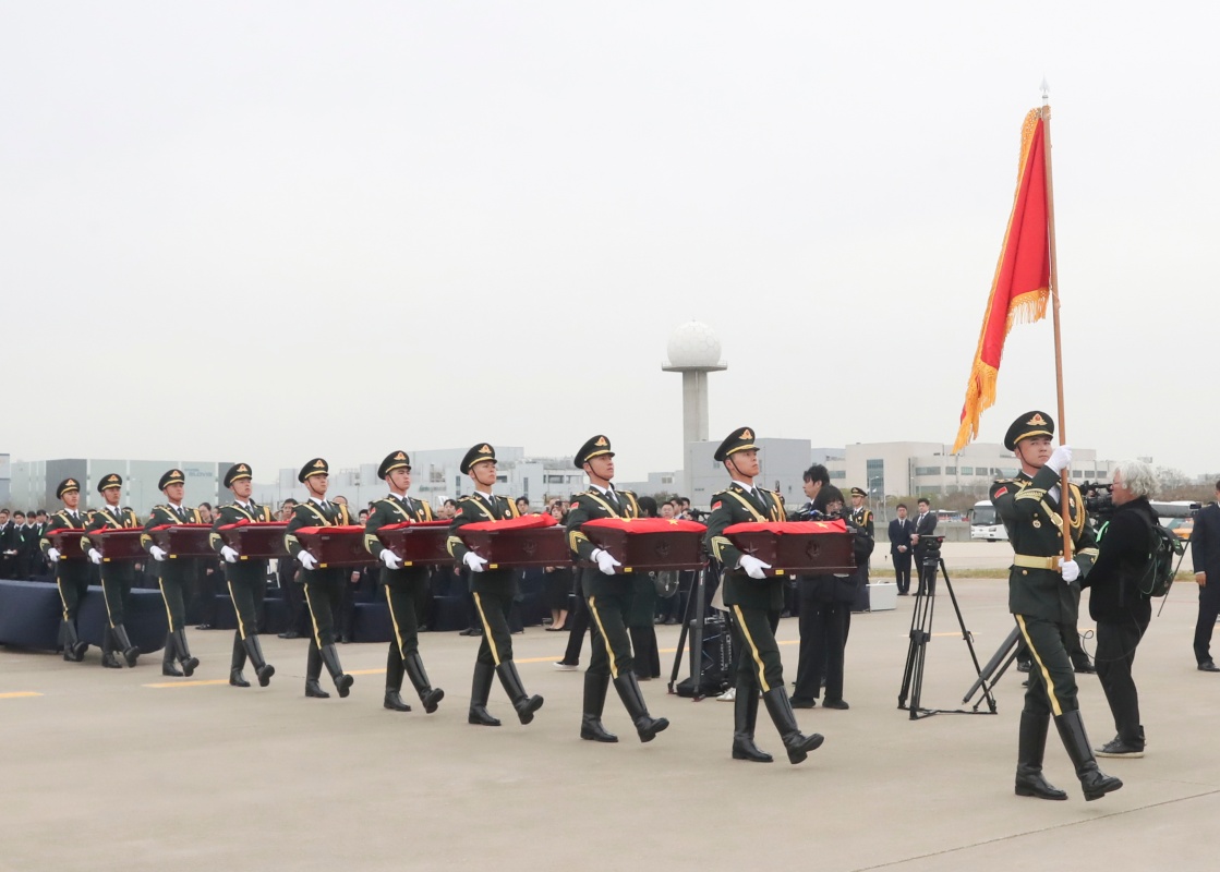 4月22日上午,中韩双方在韩国仁川国际机场共同举行交接仪式,韩方向中方移交第十三批12位在韩中国人民志愿军烈士遗骸及146件遗物。退役军人事务部副部长徐耀率中方交接代表团、韩国国防部次官李斗熙率韩国送还中国军人遗骸代表团出席仪式。中韩双方代表现场签署交接书,中方举行悼念仪式,现场唱响中华人民共和国国歌,中国驻韩国大使戴兵为志愿军烈士棺椁覆盖国旗,中方全体人员向志愿军烈士遗骸行三鞠躬礼,中国人民解放军仪仗司礼大队礼兵持国旗护送烈士棺椁登上解放军空军运-20B运输机,烈士英灵将回到祖国和人民怀抱。